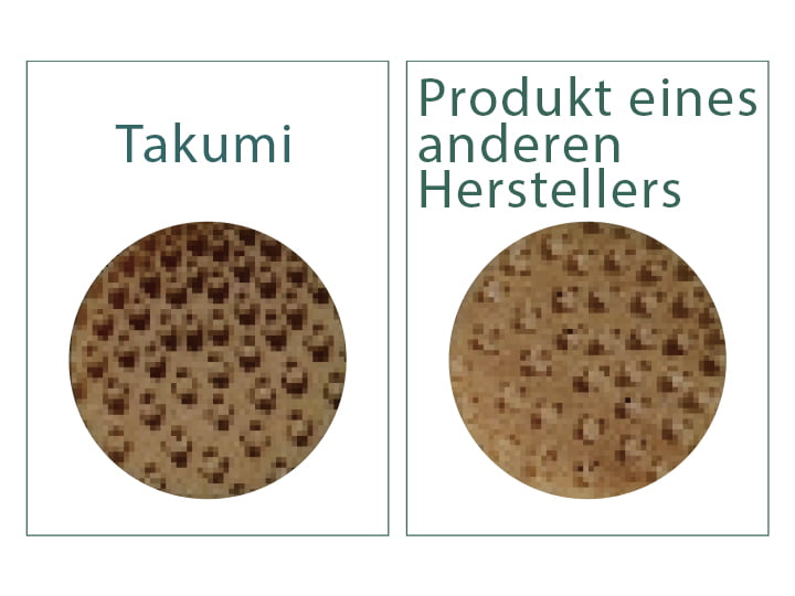 Takumi verwendet nur Bambus mit einem optimalen Alter (von 4 bis 5 Jahren), welches sich durch seine Festigkeit sowie eine einheitliche Breite und Länge auszeichnet. Junger Bambus von weniger als 3 Jahren ist zu weich, wohingegen Bambus, der über 5 Jahre alt ist, zu zerbrechlich ist. Im Alter von 4 bis 5 Jahren weist Bambus die längste Haltbarkeit auf. Wir verwenden nur im Winter geschnittenen Bambus. Bambus enthält im Winter weniger Feuchtigkeit und die Fasern sind kompakter.