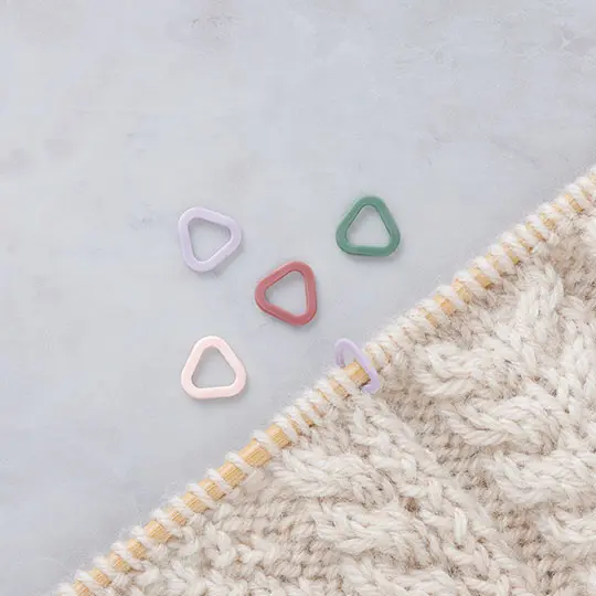 Die einzigartige Dreiecksform ermöglicht ein einfaches Gleiten der Stricknadelspitzen beim Übertragen von Markierungen von einer Nadel auf eine andere.