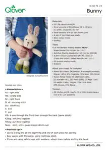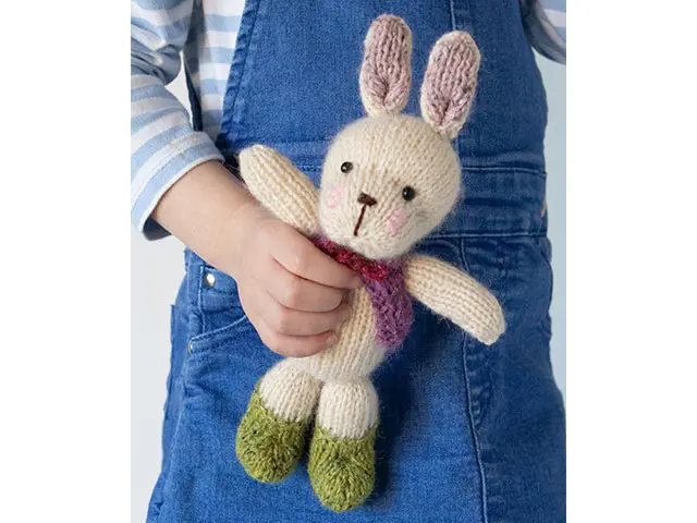 Mit 4 Ply dunkelbraun, Nase und Mund aufsticken. Mit 4 Ply rosa, Schnurrhaare aufsticken. Bein annähen und ausstopfen. Mit Garn C den Fuß von der Sohlenmitte aus durchstechen und die Nadel aus dem Knöchel herausnehmen und wiederholen. Garn ziehen, um die Sohle zu glätten und den Knöchel zu formen. Das Ganze für das zweite Bein wiederholen und Beine am Rumpf anbringen. Mit vernähtem Garnende, Arme annähen und ausstopfen. Abkettkante von jedem Arm am Rumpf anbringen. Kopf anbringen. Garn in Weste einweben Garn endet auf der LS. Schnüre an der Vorderseite der Weste anbringen. Häschen die Weste anziehen und die Schnüre zu einer Schleife binden.