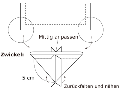 Nähen Sie die unteren Ecken 5 cm von der Spitze entfernt, um Zwickel zu bilden (siehe Diagramm).