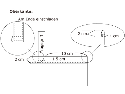 Falten und schlagen Sie die Zugabe an den kurzen Kanten ein und bringen Sie die Tragegriffe an der Tasche an (siehe Diagramm).
