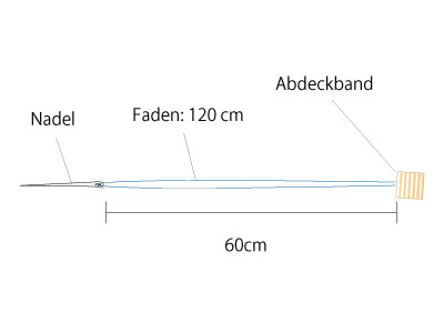 Das Nähgarn wie im Diagramm gezeigt in die Stopfnadel einfädeln. Abdeckband an den Fadenenden anbringen (siehe Abbildung). Dadurch wird verhindert, dass der Faden durch den groben Tüllstoff geht.