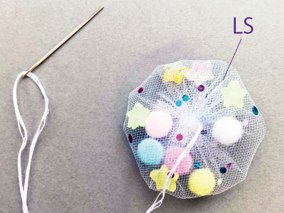 Beide losen Enden in die Stopfnadel einfädeln und sie von der Vorderseite des Jo-Jos nach hinten durchziehen, wobei das Pompon und die Anhänger gleichmäßig im Tüll zu verteilen sind.