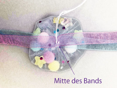 3 Stränge Organzaband mittig auf die linke Seite des Jo-Jos legen. Die Bänder mit den Fäden aus Schritt 5 sicher in der Mitte des Jo-Jos festnähen.