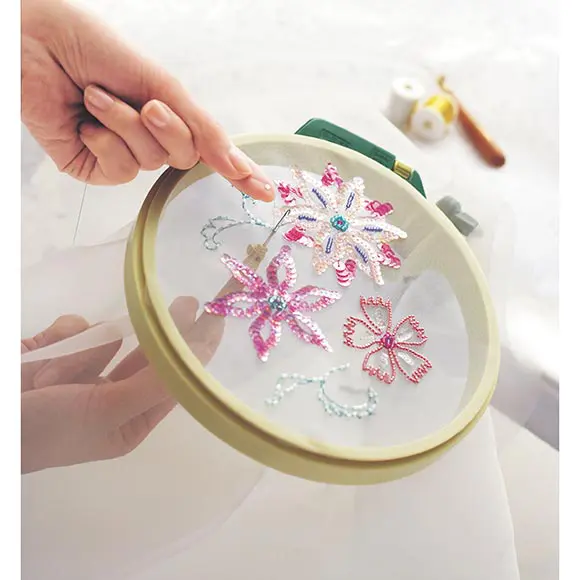 El antiguo arte del bordado usando un ganchito sobre un tejido delicado y tensado en un bastidor se llama “bordado al tambor”, y gracias a la nueva herramienta para bordar con cuentas, vuelve a estar de actualidad. Con las técnicas básicas de esta herramienta, puede crear bellos diseños con lentejuelas y cuentas. Haga sus propios diseños. Su imaginación hará que las posibilidades sean infinitas.