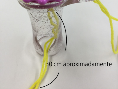 Prepare la Tejedora maravillosa con el disco rosa (3 clavijas). Enhebre 30 cm de hilo a través del centro de la Tejedora maravillosa antes de montar los puntos. Utilice 2 hebras juntas del hilo de lana DK. Teja el cordón utilizando la Tejedora maravillosa hasta que tenga una longitud de 1,72 m. Deje un extremo de aproximadamente 30 cm antes de cortar el hilo de lana.