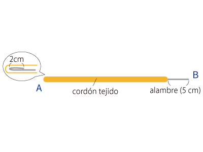 Inserte el alambre para hacer manualidades de 1,72m a través del cordón tejido con el extremo delantero del alambre (A) 2 cm doblado. Cuando el alambre haya pasado por todo el cordón, cierre el extremo (A) utilizando el extremo del hilo enhebrado en la aguja de zurcir y cósalo bien para asegurarse de que el alambre no salga. Deje el otro extremo (B) con 5 cm de alambre saliendo a través del cordón tejido.