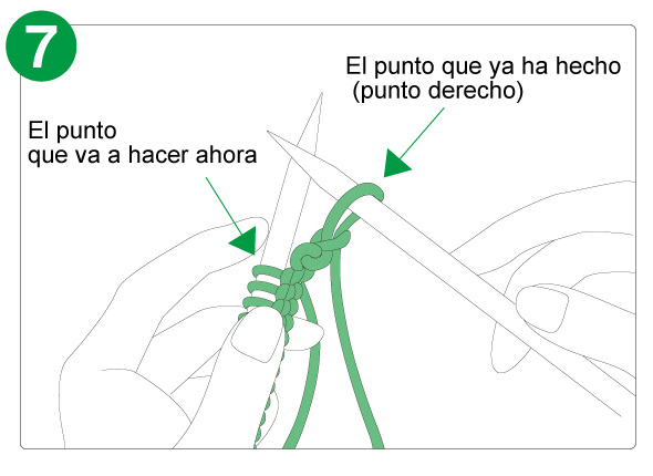 Inserte la punta de la aguja derecha en el primer punto de la aguja izquierda, de adelante hacia atrás.