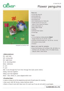 Mit vernähtem Garnende, Rumpf bis zur Hälfe nähen. Mit dem angeschlagenen Garnende einen Kräuselfaden entlang des Anschlagrands ausarbeiten und festziehen. Rumpf ausstopfen und Naht schließen. Flügel längsweise falten und Kanten ohne Füllstoff zusammennähen. Flügel am Rumpf anbringen. Hut annähen und ihn am Kopf anbringen. Rotes DK um den Hut wickeln, die Umwicklung mit ein paar Stichen befestigen und eine Schleife auf der Rückseite für das Farbband anfertigen. Blumen am Hut anbringen und mit dem gelben Knötenstich an den Mitten versehen. Schnabel anbringen. Augen anbringen. Füße am Rumpf anbringen. Blumenstrauß zwischen Flügel und Rumpf einklemmen und mit ein paar Stichen an Ort und Stelle befestigen.
