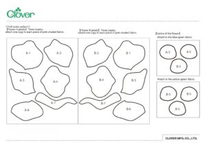 Das Blumenlayout-Diagramm und anschließend die hitzebeständige Matte für Applikationen auf das Bügelbrett legen. Als nächstes die Blütenblätter von ② gemäß dem Layout-Diagramm in der Reihenfolge A-1 bis 7 und B-1 bis 7 platzieren, nachdem man das Trennpapier abgezogen hat.