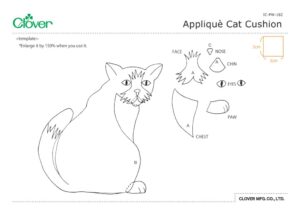 Cut the appliqué pieces out exactly. Build the cat with the body in the middle of the centre panel. Then add the white parts remembering that where you see a dashed line on the template, that piece goes under another. Finish with the green eyes and the brick red nose. Thread your machine with black thread and use a darning foot to finish the appliqué with Free Motion Embroidery.