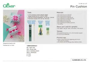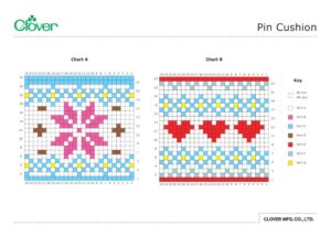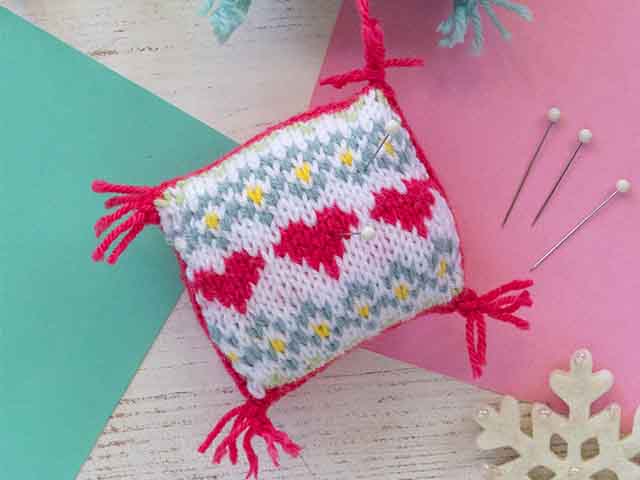 Weave in all yarn ends on wrong side of piece. Sew side seams and stuff, then sew top edge closed. To make fringes, cut an 8cm length of yarn C (Design A) or yarn E (Design B), fold in half and thread a needle with both ends of the folded strand. Insert the needle from front to back at corner of pin cushion but do not pull strand all the way through. Remove needle from strand, leaving yarn ends at the back of the cushion and the folded loop at the front. Thread the yarn ends through the loop and pull tightly. Trim yarn ends to neaten if desired. Repeat to add a couple more fringes to the same corner, then repeat to make fringes for remaining three corners.