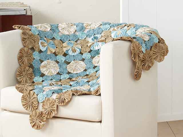 Follow the layout illustration using thread that matches the joining yo-yos. A whip stitch centered on the yo-yos to be joined is all that's needed. No backing or batting is required.