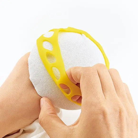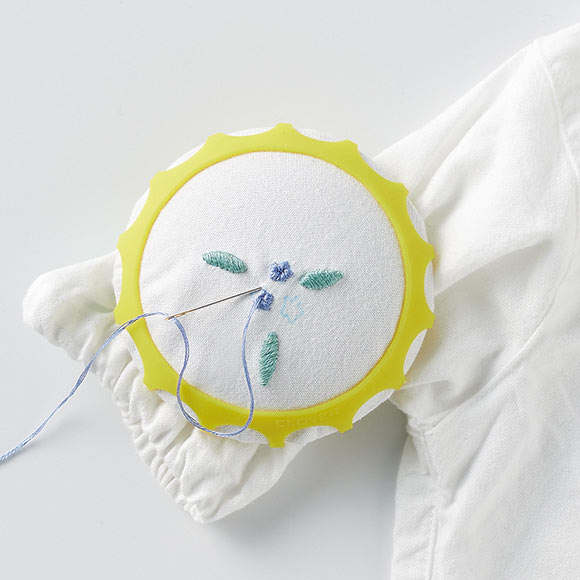 2. Sujete la tela con la banda elástica, trabaje en su bordado o vainica utilizando la superficie de la Cúpula para Coser.