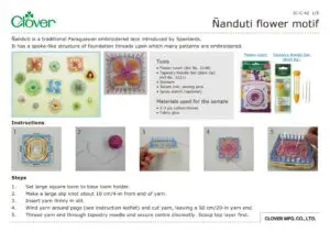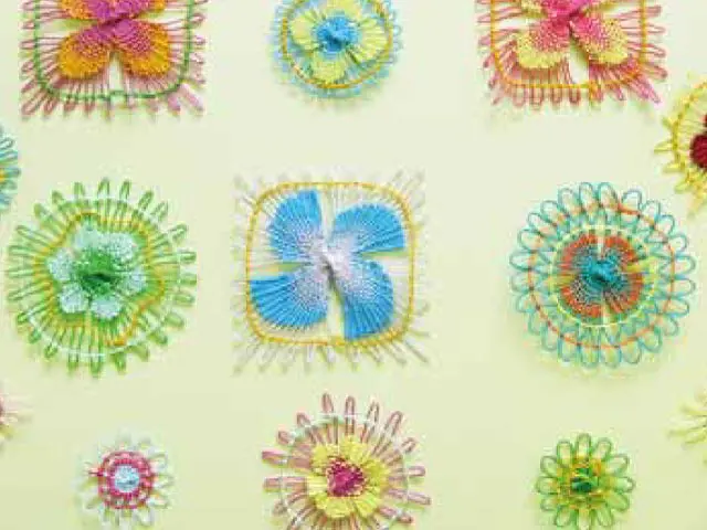 Repetir los pasos 14–16 sobre las siguientes 8 estaquillas para hacer el segundo pétalo, luego añadir otra hebra de hilo y hacer dos pétalos más.