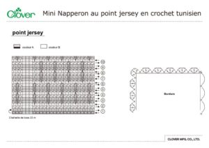 Commencez avec le fil A. Crochetez 24 rangs sur 23 chaînettes de base. Suivez le diagramme pour le reste du travail. Faites un point tunisien coulé pour fermer le rang avec la couleur A. Faites la bordure avec le fil B.