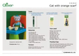 With cast-on yarn end, work a gathering thread along cast-on edge and draw tightly. Sew body seam to neck and stuff. Seam legs, stuff and attach them to body. Fold arm piece lengthwise and using the fastened-off yarn end, sew hand seam. Sew arm seam to cast-on edge, stuff arms and attach them to body. With fastened-off yarn end of head, sew seam halfway. With cast-on yarn end, work a gathering thread along cast-on edge and draw tightly. Attach safety eyes. Sew up seam a little further, stuff, and close seam. Seam muzzle, insert toy stuffing into muzzle and sew the cast-off edge of muzzle to head. Seam ears and sew them to head. With yarn G, embroider nose and mouth. With yarn H, embroider whiskers. Sew head to neck. Seam tail, stuff and attach tail to body. Seam hat, insert stuffing into hat and attach hat to head. Wrap main scarf piece around neck and stitch two corners together at the front neck. Attach two front scarf pieces.