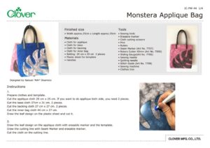 Prepare cloths and template. Cut the applique cloth 25 cm x 25 cm. If you want to do applique both side, you need 2 pieces. Cut the base cloth 27cm x 31 cm. 2 pieces. Cut the backing cloth 27 cm x 27 cm. 2 pieces. Cut the inner bag cloth 44 cm x 27 cm. Draw the leaf design on the plastic sheet and cut it.