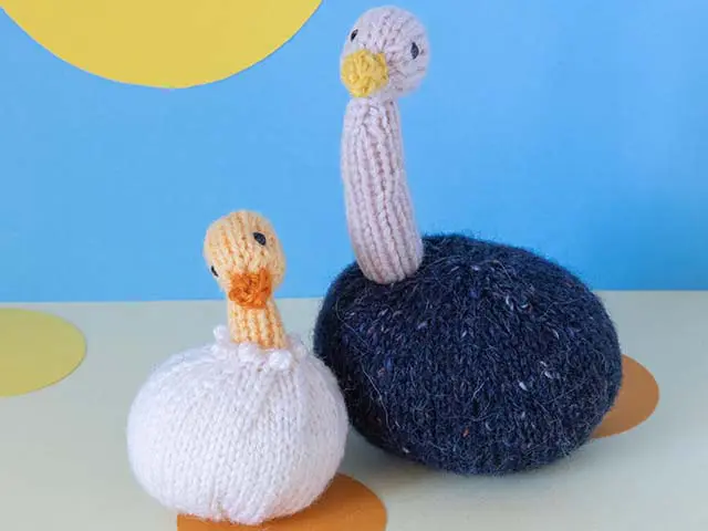 With cast-on yarn end of shell, work a gathering thread along cast-on edge and draw tightly. Sew seam to finished edge and stuff. Make up neck and head as for Mummy. Insert neck into shell opening and secure neck to shell.